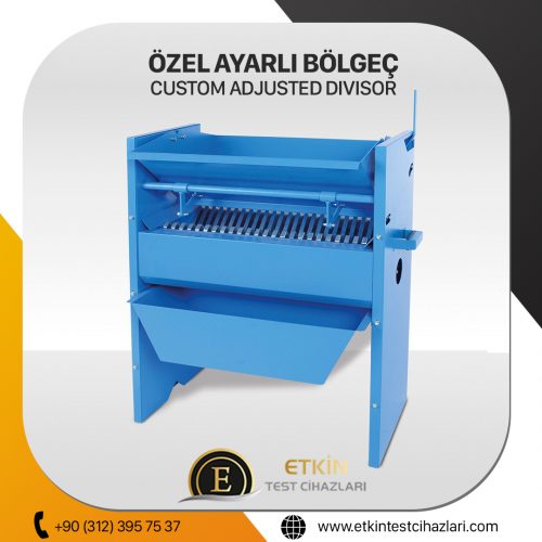 Özel ayarlı bölgeç, ETA- 001 ürün kodu ile satışa sunulmuştur. Agrega test cihazları arasında yer almaktadır. Kum, çakıl, taş gibi betonun ham maddesini oluşturan agrega numuneleri laboratuara test için getirilir. Özel ayarlanabilir bölgeç, testlerde gerekli olan numunelerin elde edilmesi için kullanılır. İstenilen miktarda numunenin elde edilmesini sağlar. Hızlı ve pratik şekilde numunelere ulaşılabilmesinde kullanılacak en kısa yoldur. Cihaz sayesinde hacmi yüksek olan numuneler gerekli şekilde küçültülür ve deneye hazır hale getirilir. Galvaniz sac malzemeden üretilmiştir. 12.5 mm’den başlayarak 100 mm’ye kadar ayarlanabilir özelliktedir. Oluk açıklıklarının her biri 12.5 mm olarak ayarlanabilir. Bu şekilde istenen ayarda ve büyüklükte numuneler hazırlanabilir. Numune besleme haznesi oldukça geniş olup 20 litreye kadar desteklemektedir.
